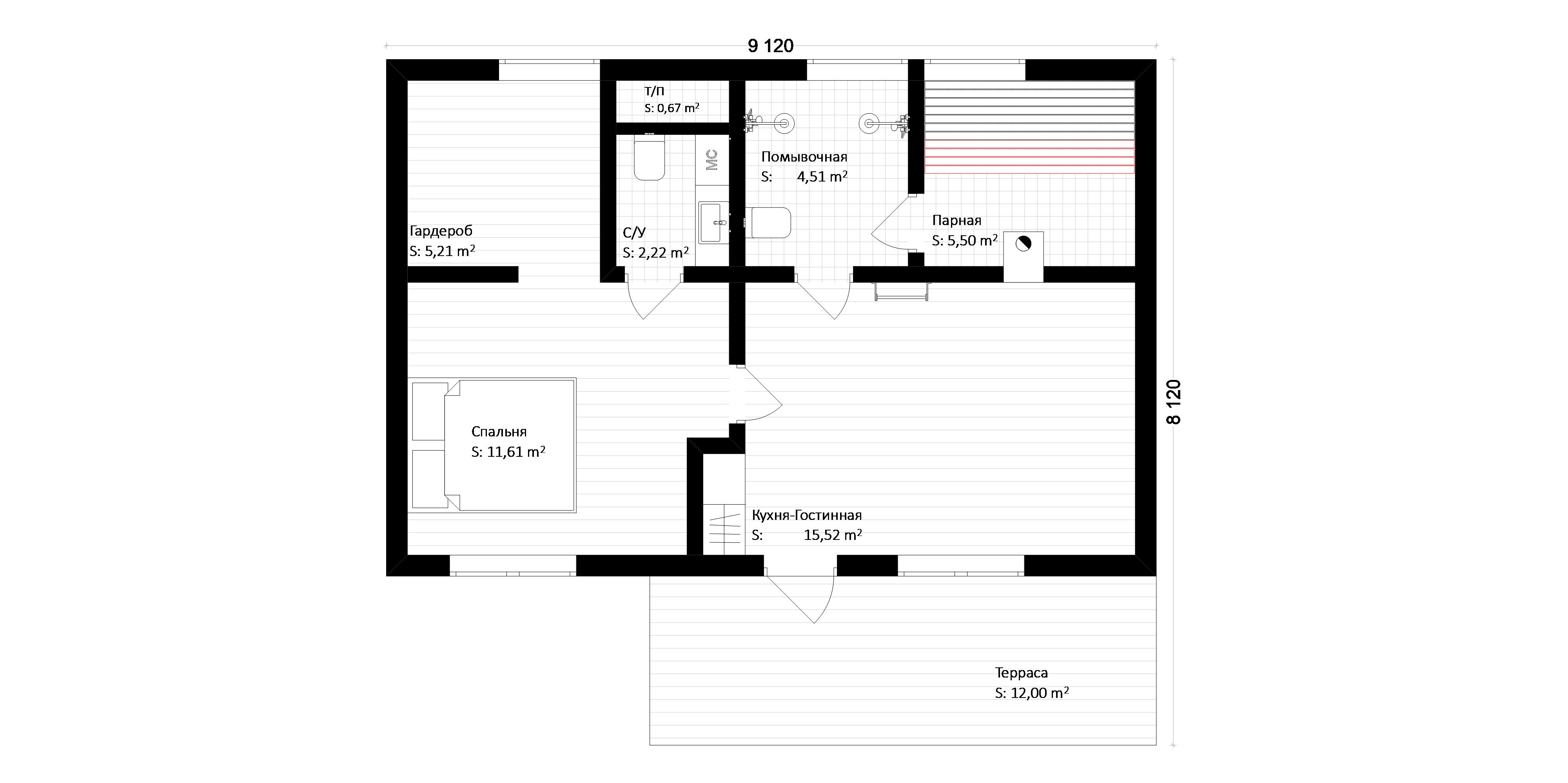 | Парная | Осиновая вагонка класс А. Теплоизоляция: фольга. Пологи: материал – осина, размеры – 30х90мм + спинка. Оснащение: отдушина размером 150х150 мм. Оборудование: экранированная кирпичом заводская печь «Ермак»; тип трубы: сэндвич. |