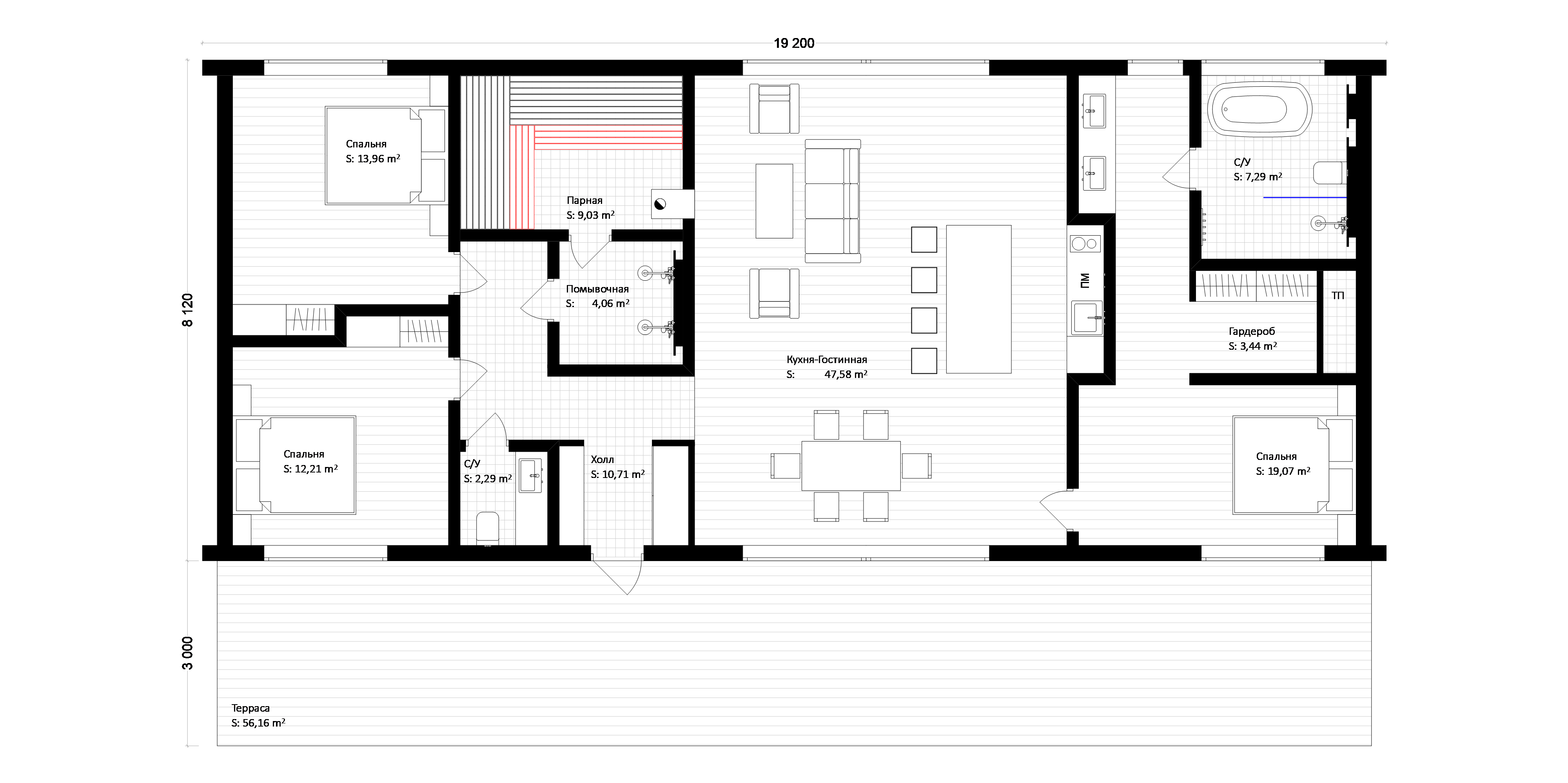 | Двери | Металлическая (Россия) – для входной; Филёнчатые – для межкомнатных; стеклянная дверь – для парной. Оснащение: заводская фурнитура, наличники. |