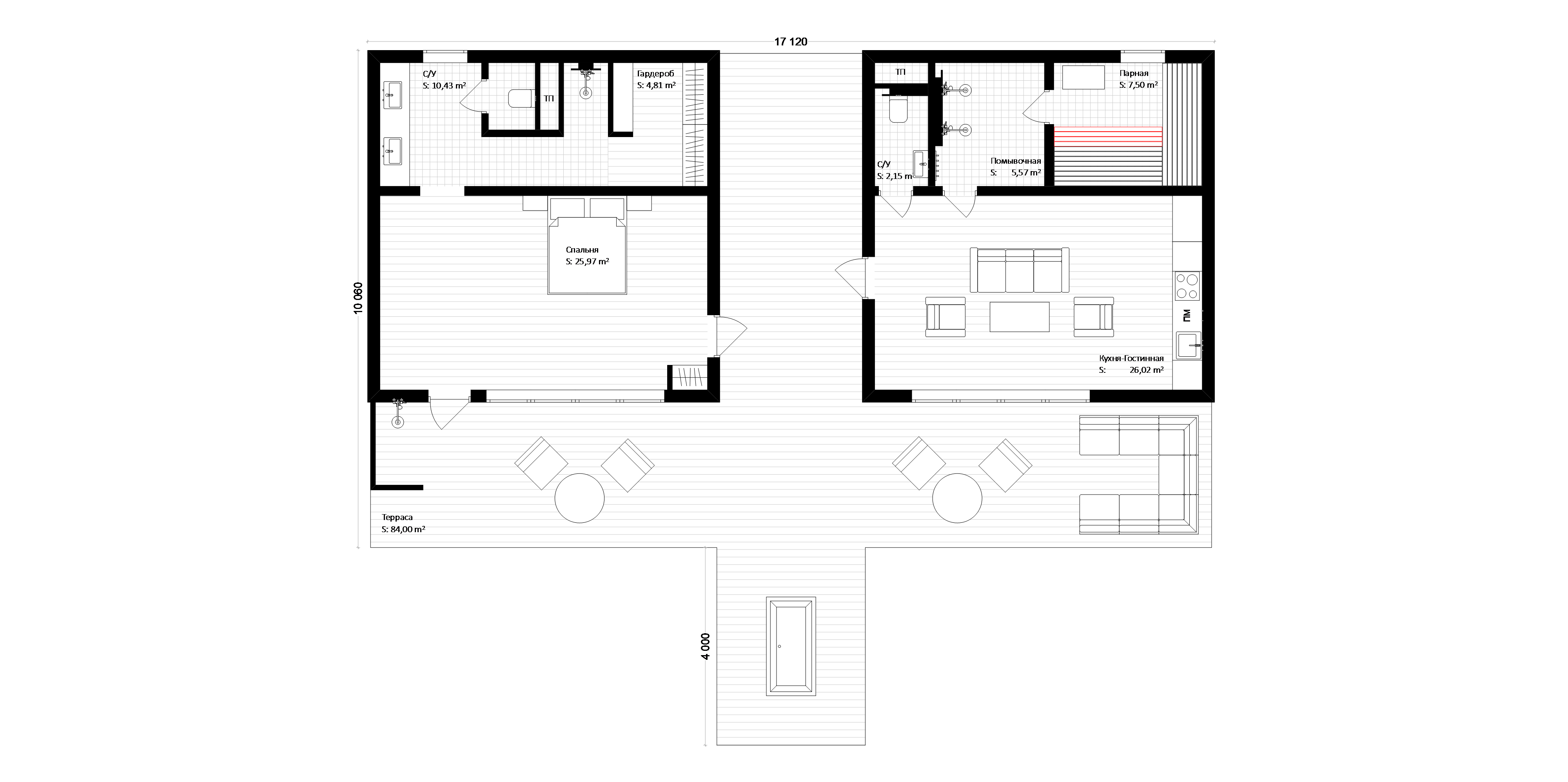 | Парная | Осиновая вагонка класс А. Теплоизоляция: фольга. Пологи: материал – осина, размеры – 30х90мм + спинка. Оснащение: отдушина размером 150х150 мм. Оборудование: экранированная кирпичом заводская печь «Ермак»; тип трубы: сэндвич. |
