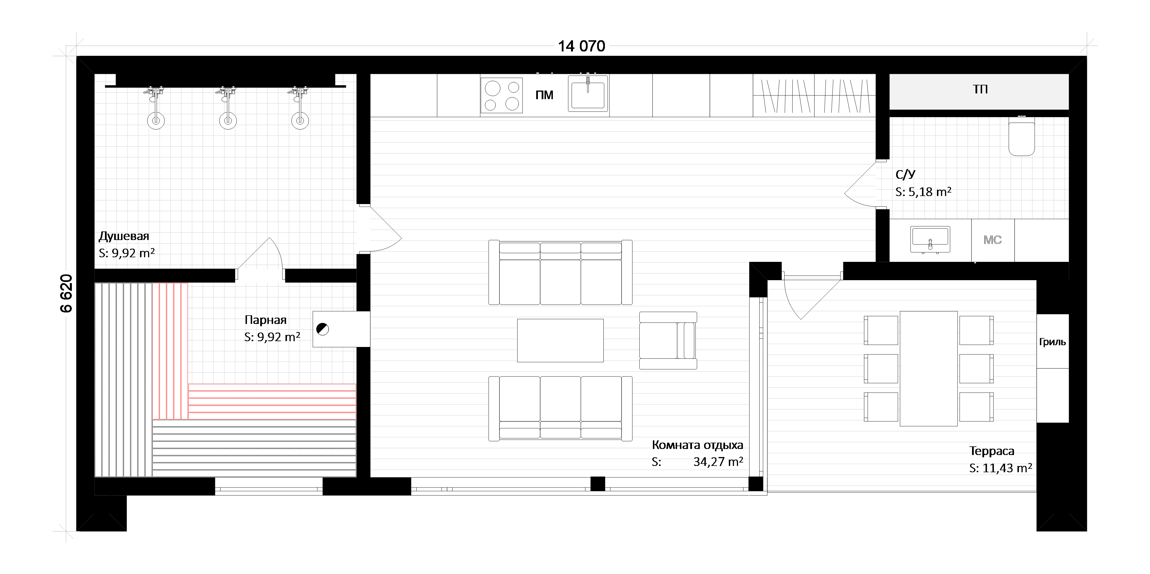 | Парная | Осиновая вагонка класс А. Теплоизоляция: фольга. Пологи: материал – осина, размеры – 30х90мм + спинка. Оснащение: отдушина размером 150х150 мм. Оборудование: экранированная кирпичом заводская печь «Ермак»; тип трубы: сэндвич. |