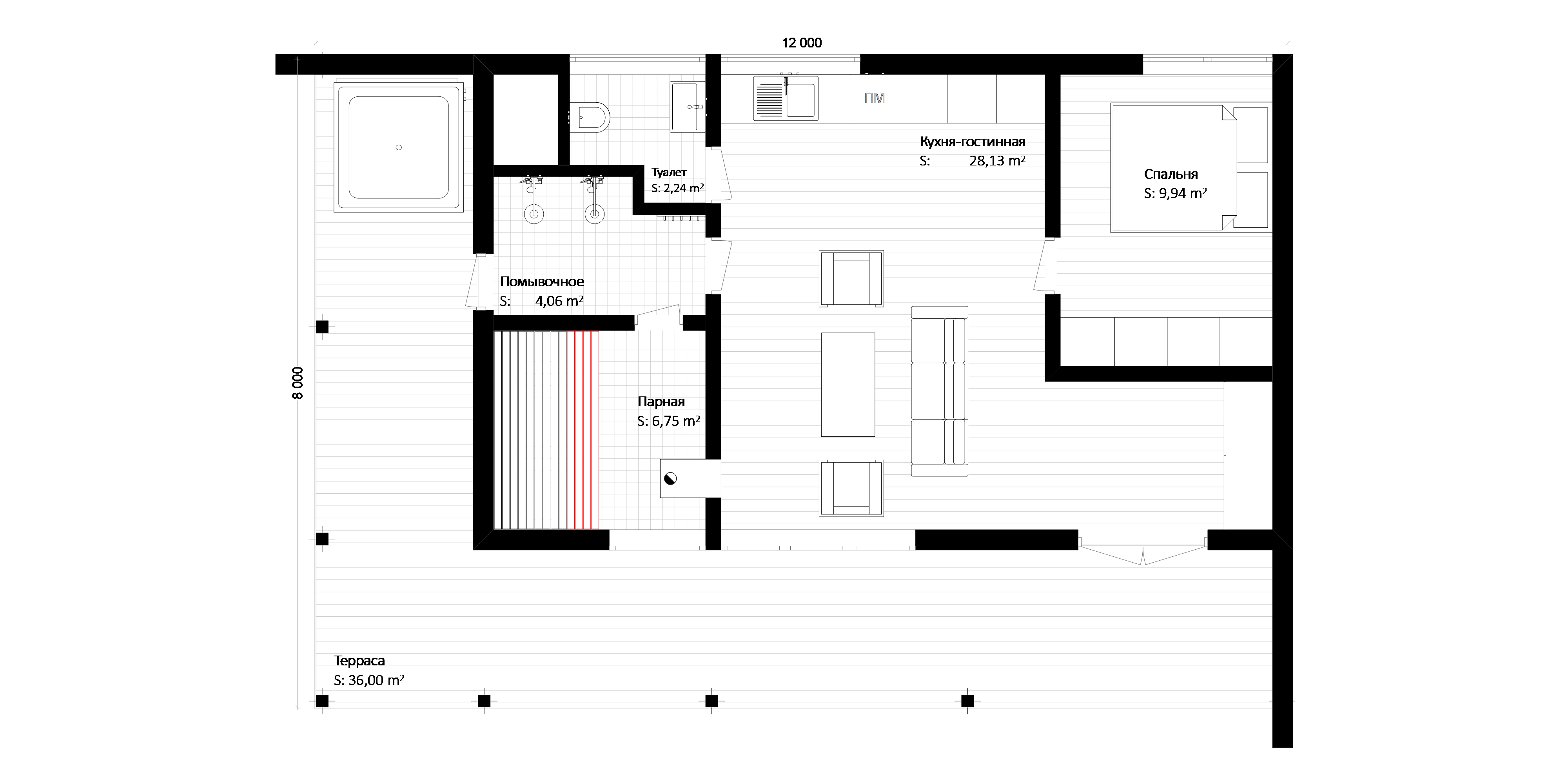 | Пол чистовой | Шпунтованная доска камерной сушки, толщина – 36 мм. Крепление: саморезы в шпунт. Тепловой зазор: не более 2 см по периметру, прикрываемый деревянным плинтусом. Утепление:150 мм. Паро-, гидроизоляция izospan. Либо подготовка под монтаж чистового пола ЦСП 10 мм. 2 слоя. |