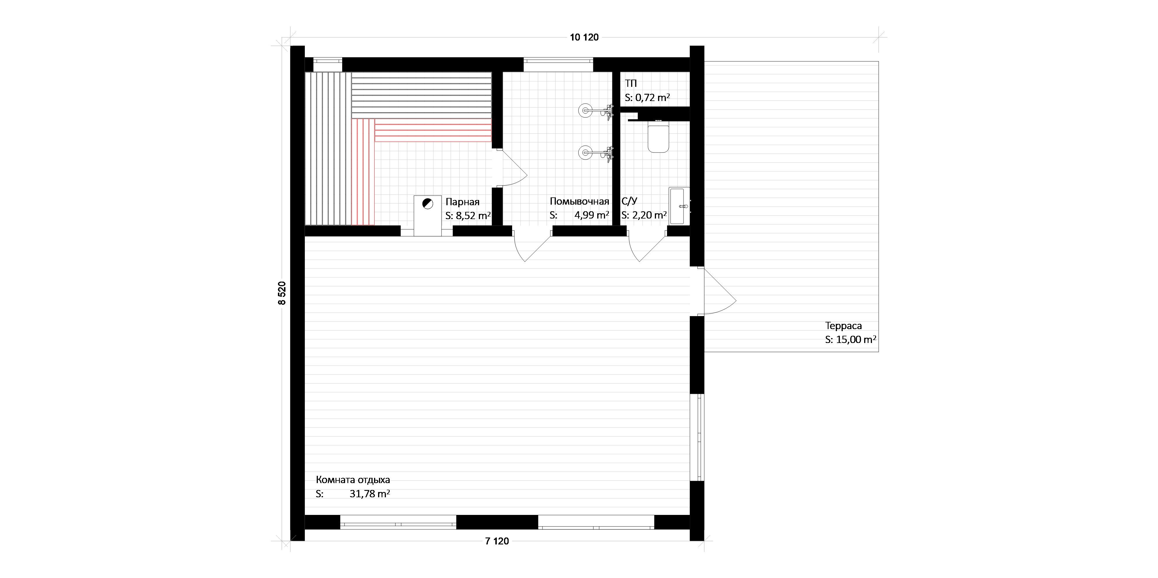 | Парная | Осиновая вагонка класс А. Теплоизоляция: фольга. Пологи: материал – осина, размеры – 30х90мм + спинка. Оснащение: отдушина размером 150х150 мм. Оборудование: экранированная кирпичом заводская печь «Ермак»; тип трубы: сэндвич. |