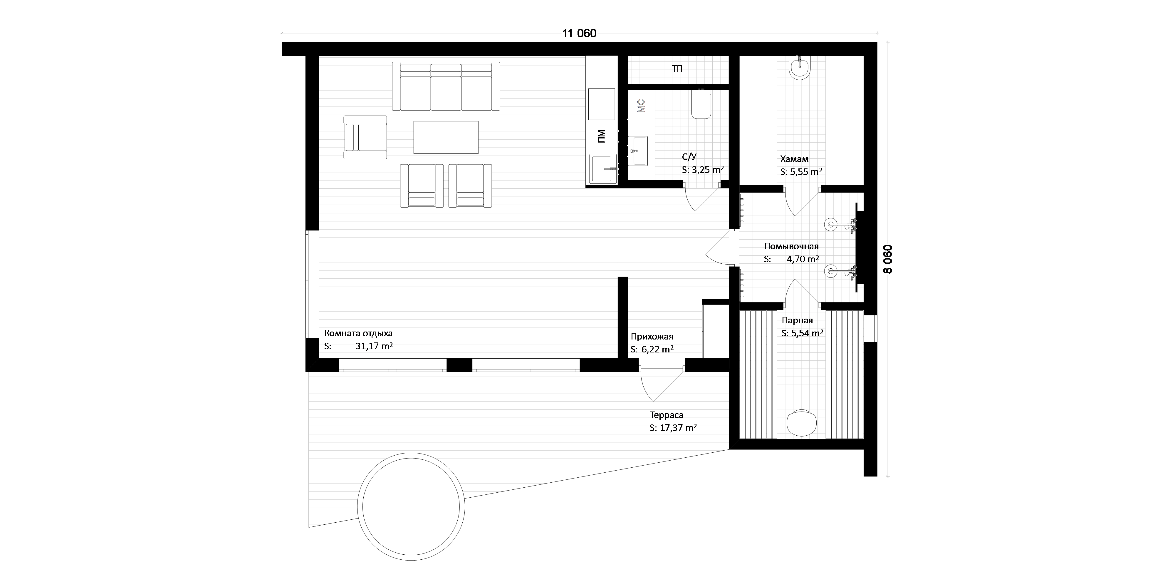 | Парная | Осиновая вагонка класс А. Теплоизоляция: фольга. Пологи: материал – осина, размеры – 30х90мм + спинка. Оснащение: отдушина размером 150х150 мм. Оборудование: экранированная кирпичом заводская печь «Ермак»; тип трубы: сэндвич. |