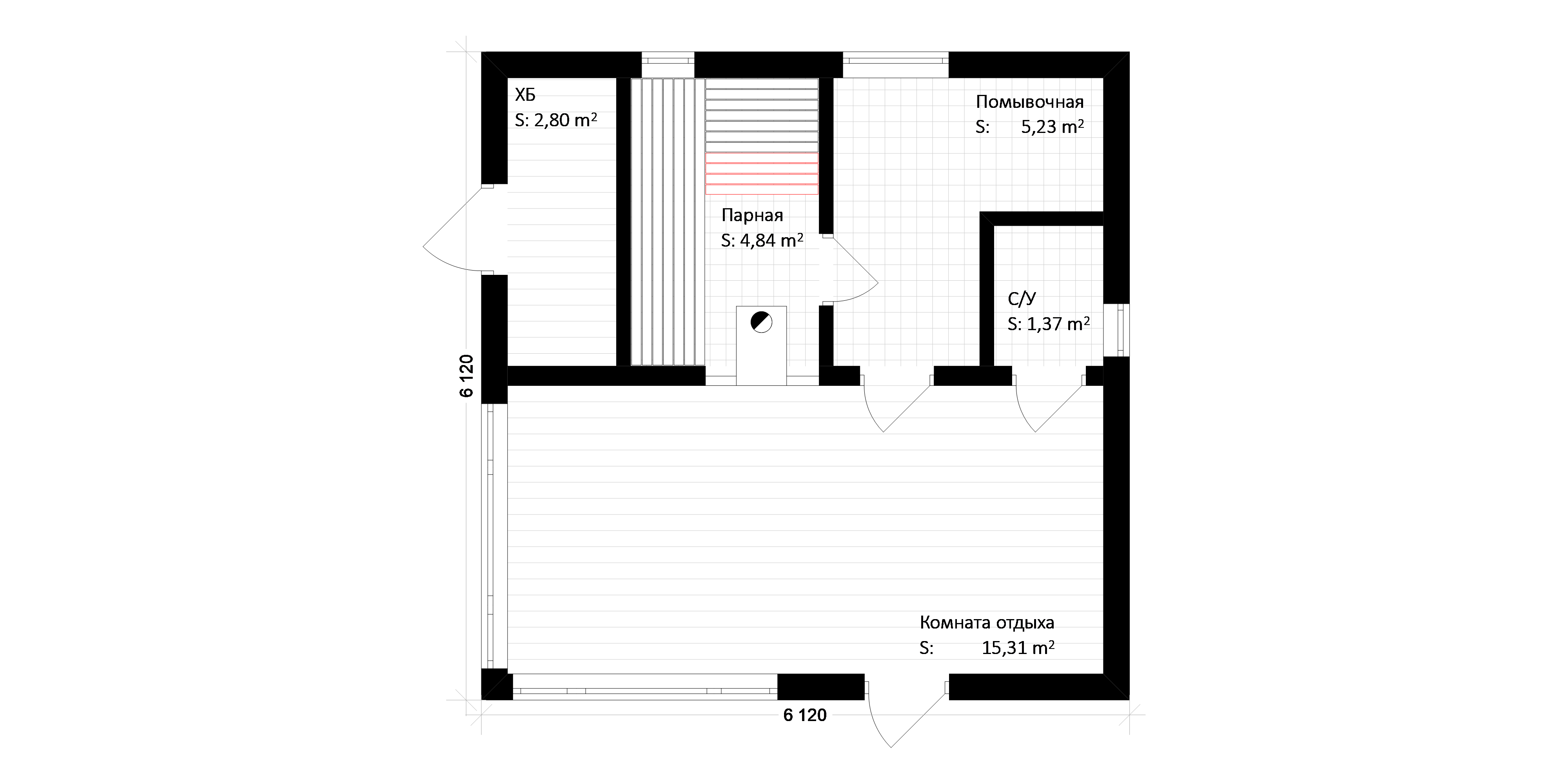 | Парная | Осиновая вагонка класс А. Теплоизоляция: фольга. Пологи: материал – осина, размеры – 30х90мм + спинка. Оснащение: отдушина размером 150х150 мм. Оборудование: экранированная кирпичом заводская печь «Ермак»; тип трубы: сэндвич. |