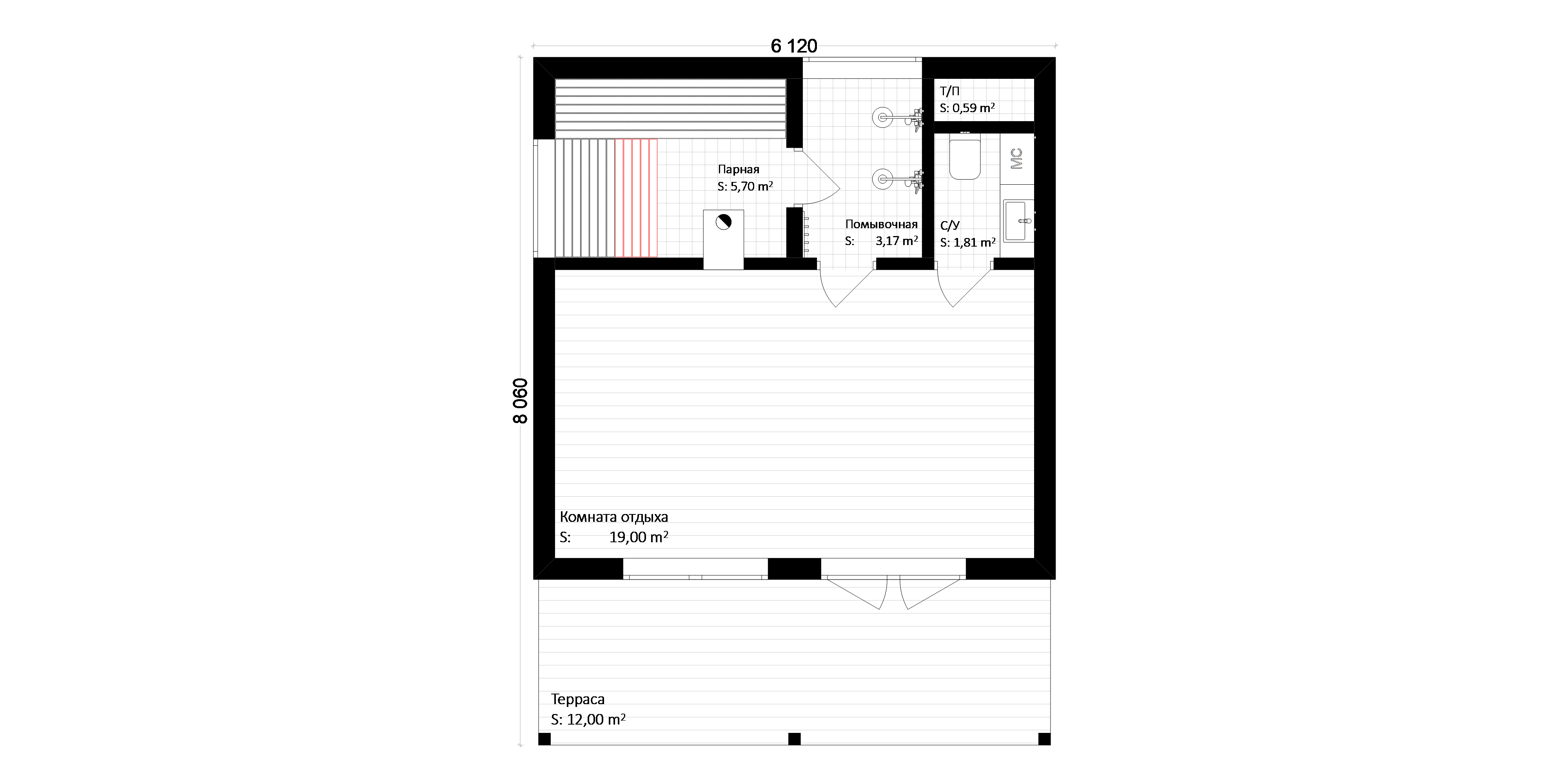 | Парная | Осиновая вагонка класс А. Теплоизоляция: фольга. Пологи: материал – осина, размеры – 30х90мм + спинка. Оснащение: отдушина размером 150х150 мм. Оборудование: экранированная кирпичом заводская печь «Ермак»; тип трубы: сэндвич. |
