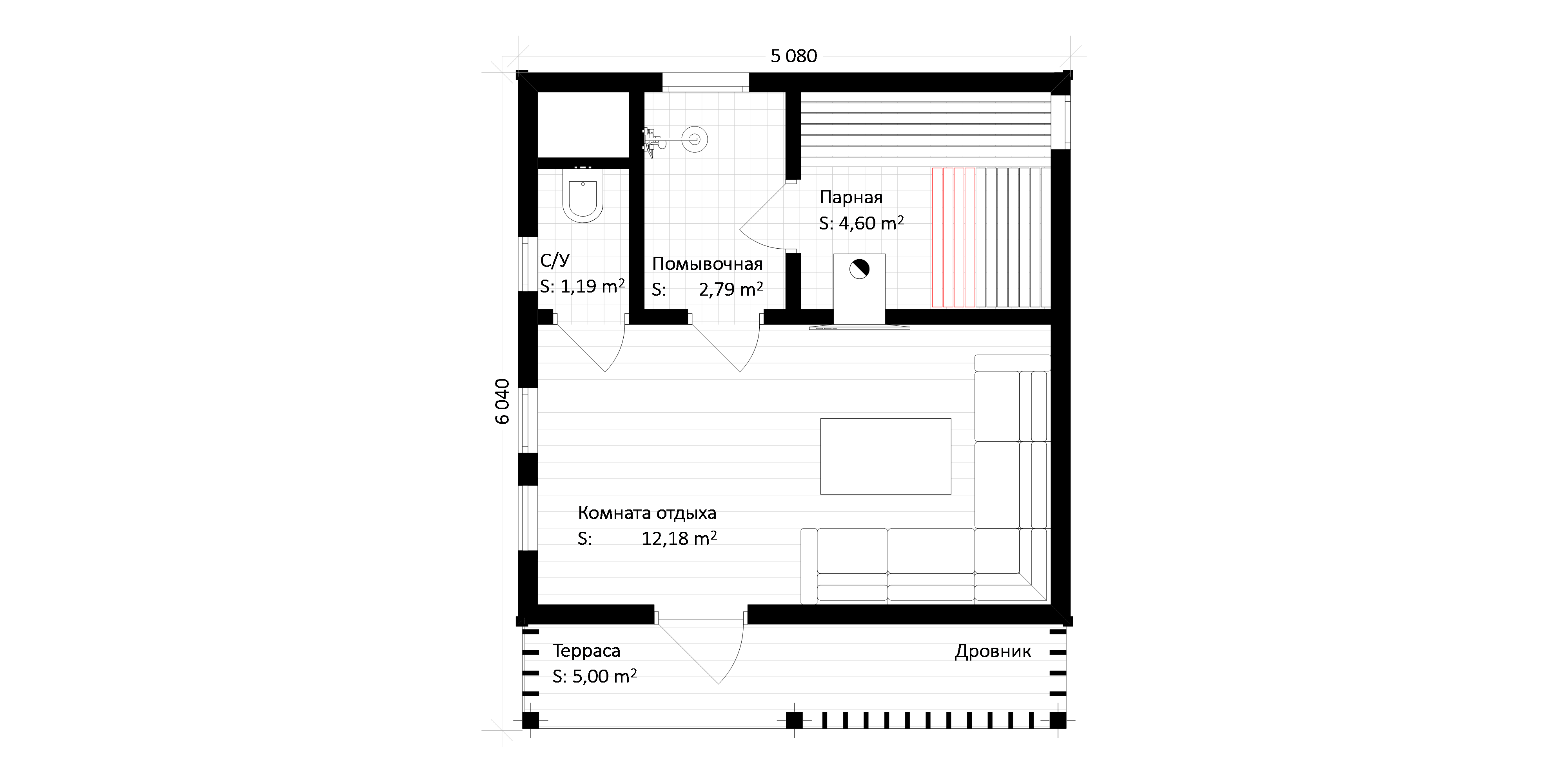 | Парная | Осиновая вагонка класс А. Теплоизоляция: фольга. Пологи: материал – осина, размеры – 30х90мм + спинка. Оснащение: отдушина размером 150х150 мм. Оборудование: экранированная кирпичом заводская печь «Ермак»; тип трубы: сэндвич. |